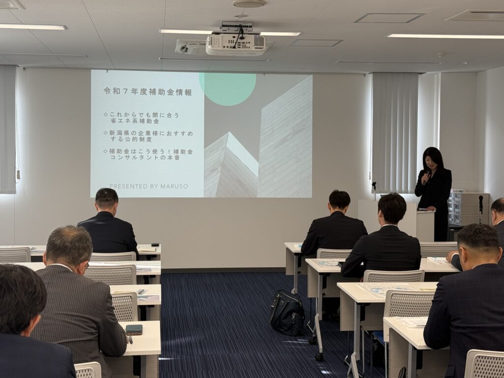 続いて、こちらも会員企業であるマルソー(株)の鶴巻翠様より、これからでも間に合う省エネ系補助金について、おすすめ順にお話をいただきました。法律の改正などで戸建て住宅、工場などのCO2削減が一層重要になってきますが、自己資金だけではなかなか整備が追いつかない方々にとってはとても参考になるお話を頂きました。
