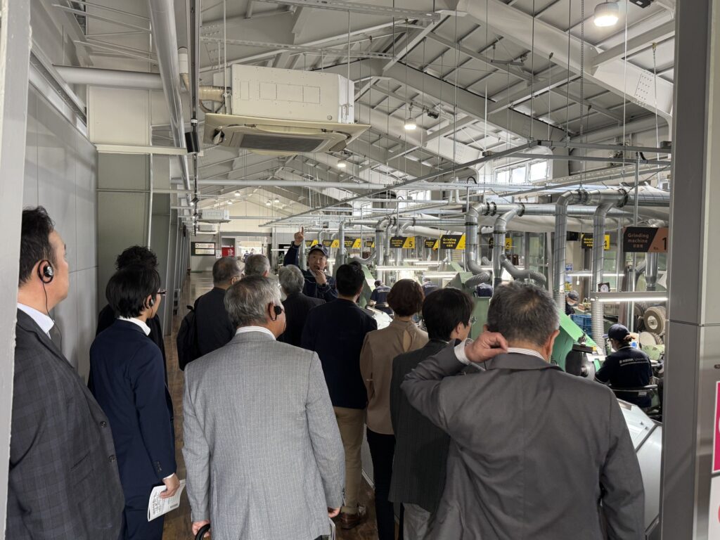 | 次に、広大な敷地内にある工場群内を周り、実際に鍛造、機械加工、焼き入れ、手作業の刃付けなど、製品が出来上がる様子を見学。参加された皆様からは感嘆の声が上がりました。 | ![]() |
