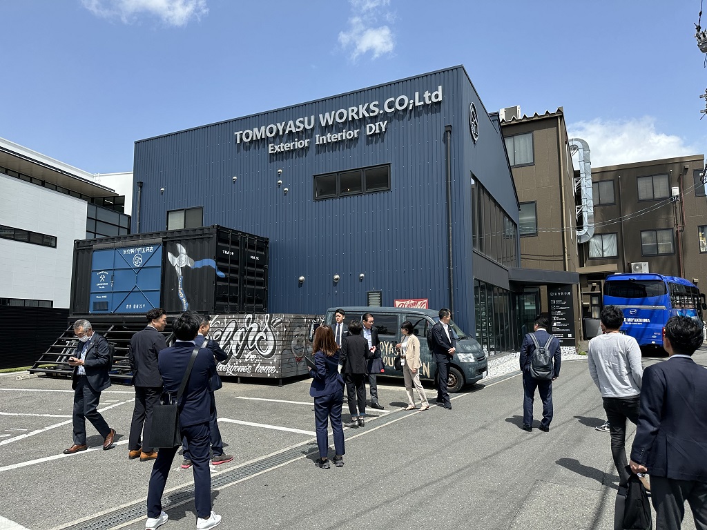 友安製作所Cafe&Barから一路友安製作所様の本社へ。 スローガンは「生きるをあそぶ」!なんとなく社内もそんな雰囲気で、全員ニックネームで呼び合うとのこと。社内の呼び出し放送もニックネームでした(笑)! |