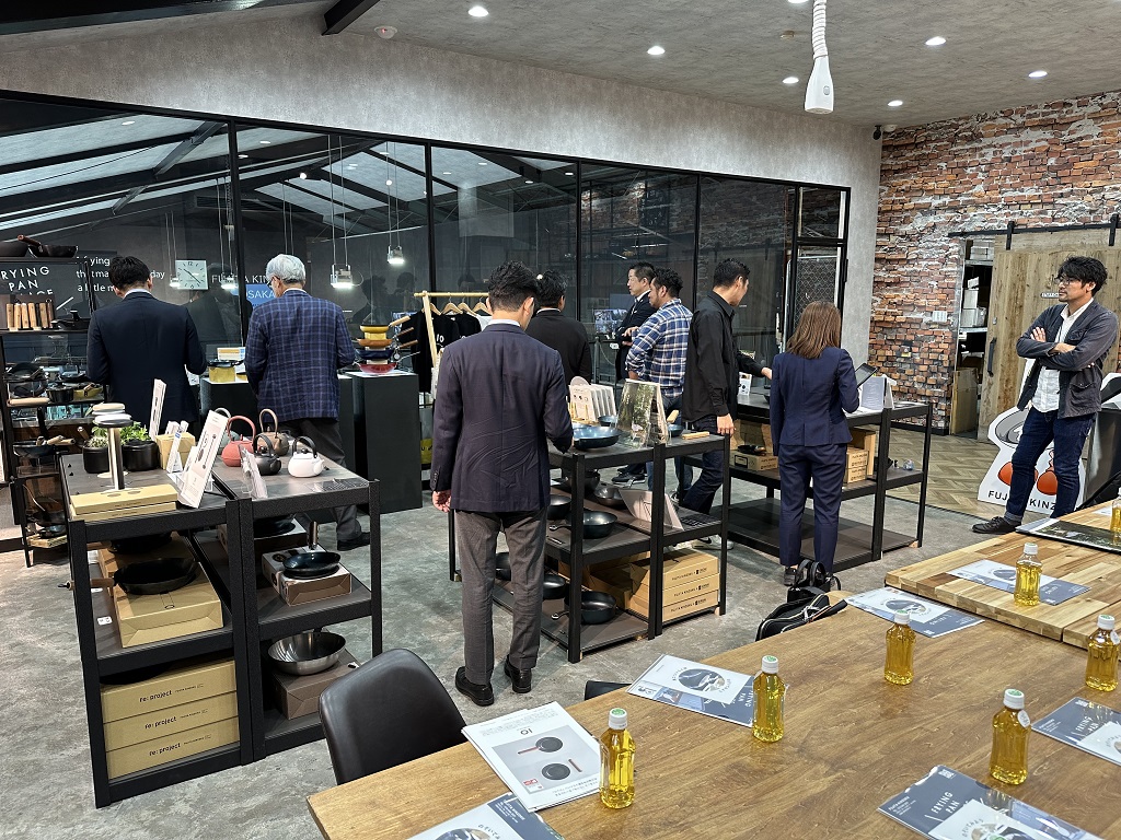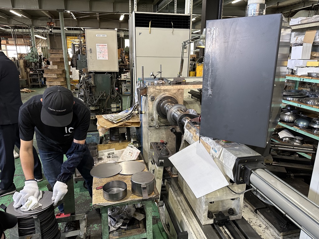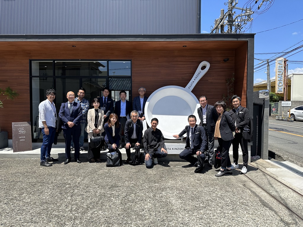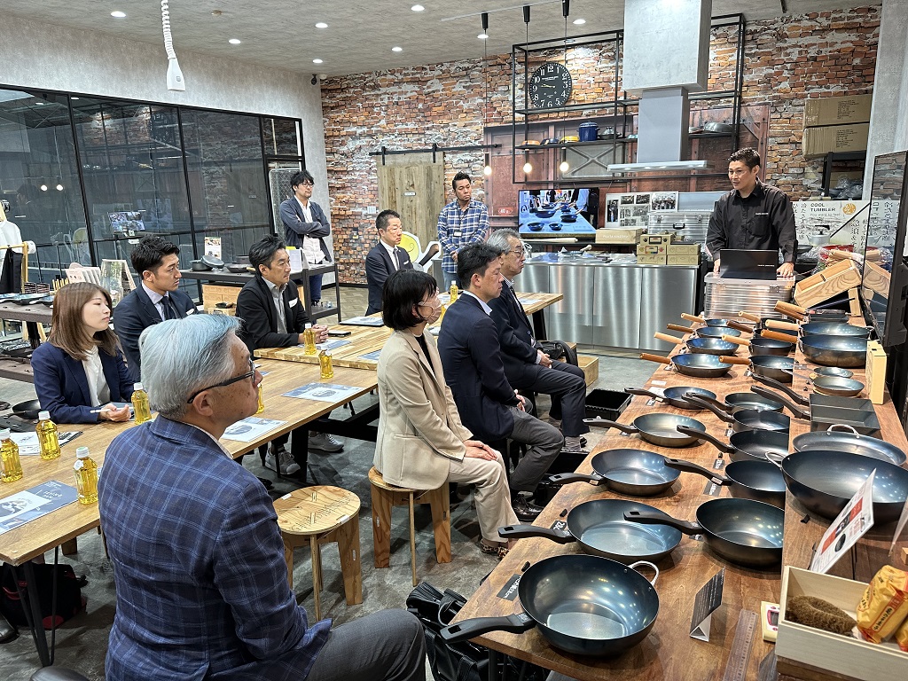 2日目、最初の訪問先はフライパン製造が主力の藤田金属様。 同社は、アルミニウム製金物の製造販売からスタートし、2021年に創業70周年を迎えました。お客様からの「日本製フライパンが欲しい」との要望を受け、12年前からフライパン製造を始めたそうです。 |