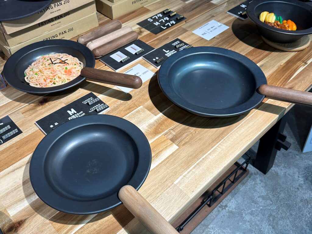 藤田盛一郎社長から会社紹介頂いたあと、工場内やショップを見学。鉄板がフライパンになるまでの工程を全て見せて頂きました。700℃の高温で焼く同社独自の「ハードテンパー加工」を施す事で、錆びにくく、長く使えるフライパンができあがります。本社入口にドーンと置いてある特大フライパンも目を引く、魅せる工場でした。 |