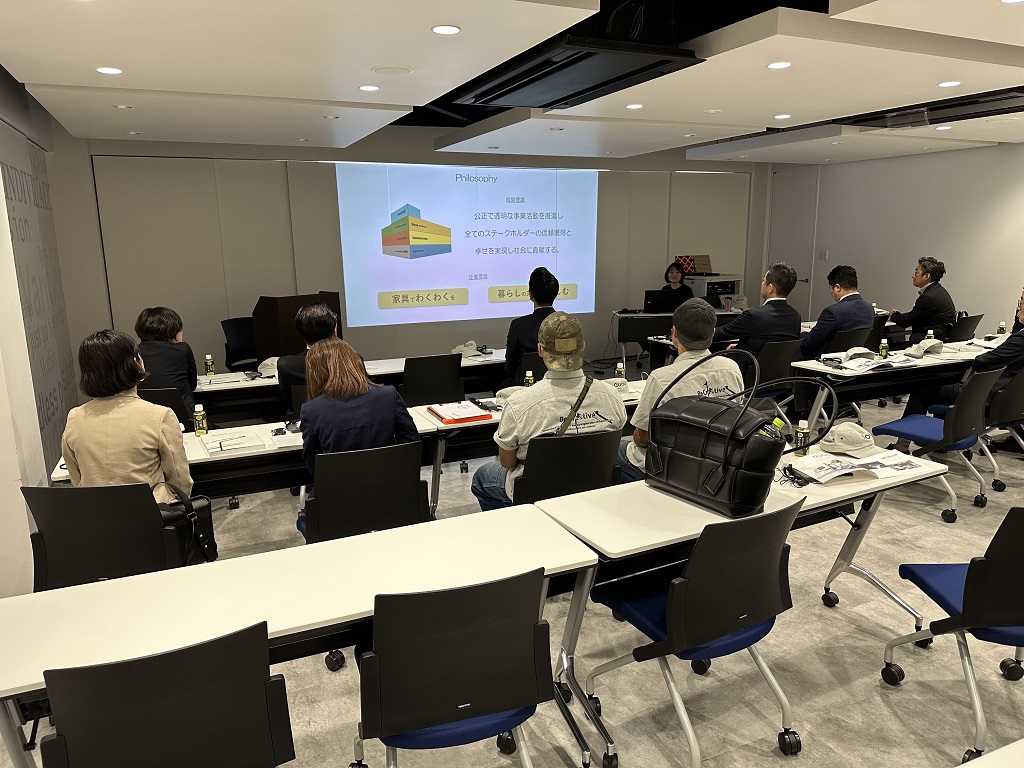 友安社長のニックネームは「Boss」だそうで、まずはボスから会社説明頂き、その後社内を見学させて頂きました。ネジ製造で創業し、カーテンフックなどの線材加工に転換。インテリア商材の輸入販売事業やカフェ、リフォームなども手掛けるライフスタイルカンパニーへと成長を遂げてこられたとの事です。 |