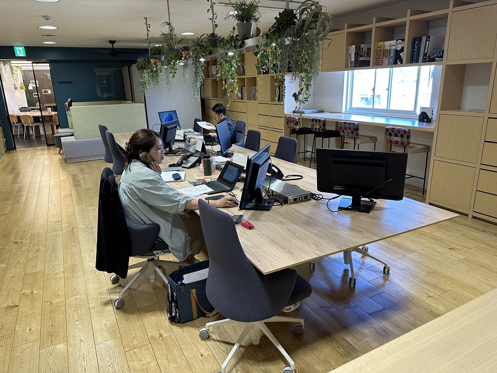 2011年に新ブランド「QUON」を発表。クオリティ、ユニバーサル、オンリーワンの3つのキーワードを組み合わせました。イス一脚から作ってくれるそうで、社内で一貫生産しています。ショールームや屋上も社員の皆さんの憩いの場として開放しており、フリーアドレスでどこでも仕事できるそうです。 |